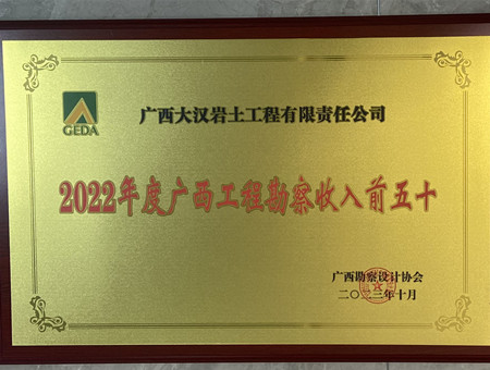 • 廣西大漢巖土工程有限責任公司榮獲“2022年度廣西工程勘察收入前五十”2023.11.07